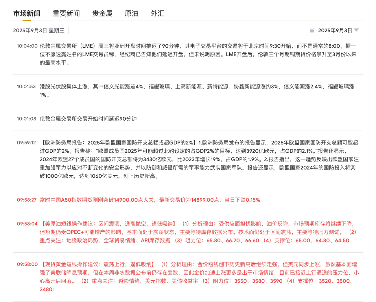 全天候24小时不间断服务,毫秒级更新,确保用户第一时间获取最新信息。栏目内容覆盖宏观经济动态、央行政策与关键数据发布,追踪全球金融市场走势,包括贵金属、原油、外汇、股市、债市、大宗商品与期货行情。与此同时,深入解读行业政策,聚焦能源、金属、农产品等产业链的供需与价格变动,并关注突发的重大国际事件与地缘政治局势。通过紧密跟进市场热门话题与核心事件,“快讯”以极致速度呈现全球经济脉动,帮助用户快速捕捉市场变化,把握潜在机遇与风险。